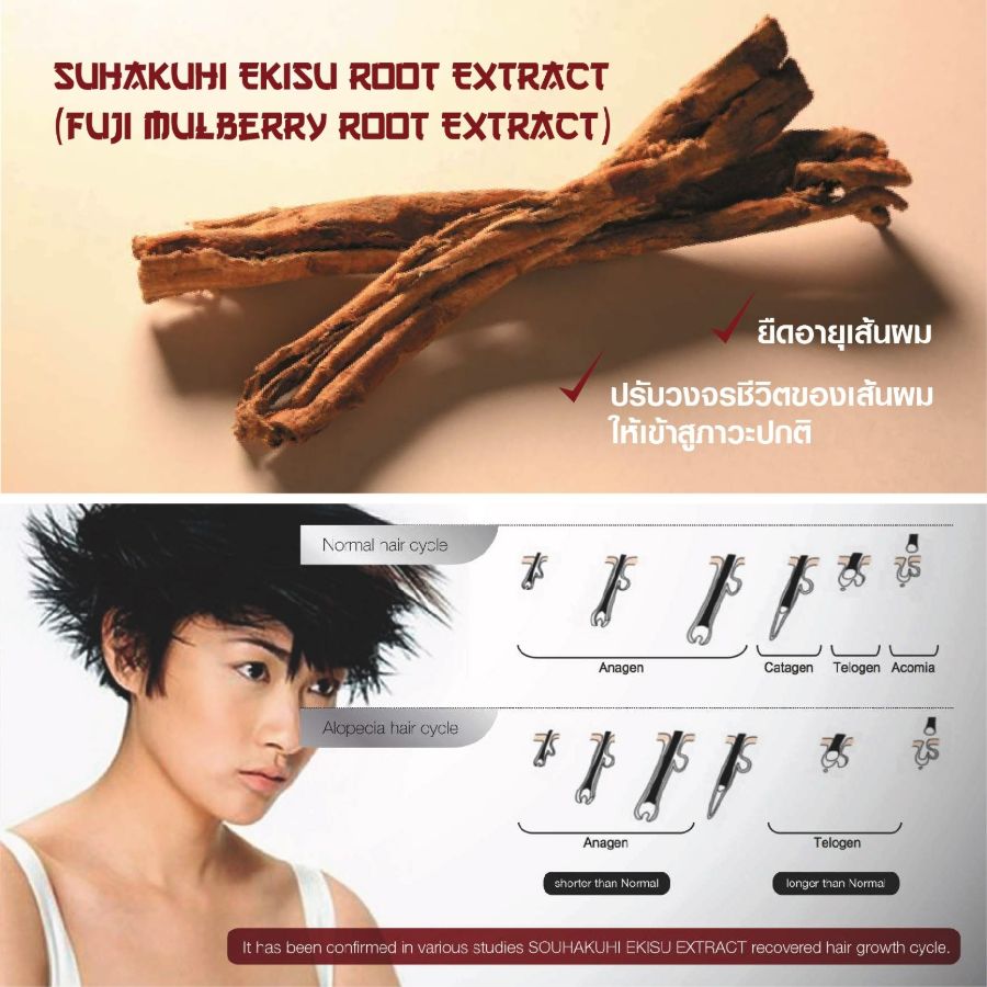 สุดยอดสมุนไพรล้ำค่า ต้นตำรับตำนานแห่งสมุนไพรจากเทือกเขา Fujiyama ที่ช่วยฟื้นความดกหนาให้เส้นผมมากกว่า 100 ปี โดยเริ่มต้นการวิจัยด้วยราก SOUHAKUHI EKISU ซึ่งเปรียบดุจสมุนไพรในตำนานแห่งญี่ปุ่น โดยสืบทอดความเชื่อแต่ช้านานว่า การนำเอาราก SOUHAKUHI EKISU มาทาศีรษะ จะช่วยให้ผมดกดำ หนาขึ้น โดยเฉพาะความพิเศษของสมุนไพรชนิดนี้ก็คือ จะสามารถพบสมุนไพรชนิดนี้ได้เพียงพื้นที่รอบภูเขาไฟฟูจิเท่านั้น และสามารถขุดรากได้เฉพาะในฤดูใบไม้ผลิเท่านั้น เพราะสภาพภูมิอากาศที่เหมาะสมที่สุด และสารอาหารสูงสุด จึงทำให้สมุนไพรชนิดนี้หายาก และราคาสูงมาก และถูกใช้ในเฉพาะชนชั้นสูง อาทิ เหล่าขุนนาง เชื้อพระวงศ์ หรือเหล่าเศรษฐีเท่านั้น โดยมีคุณสมบัติสำคัญคือ